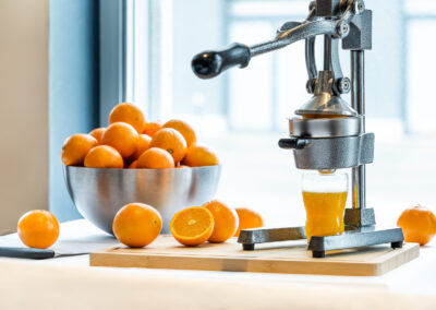 - Ein besonderes Highlight ist unsere Saftpresse, mit der Sie sich jederzeit frischen Orangensaft selbst zubereiten können.
